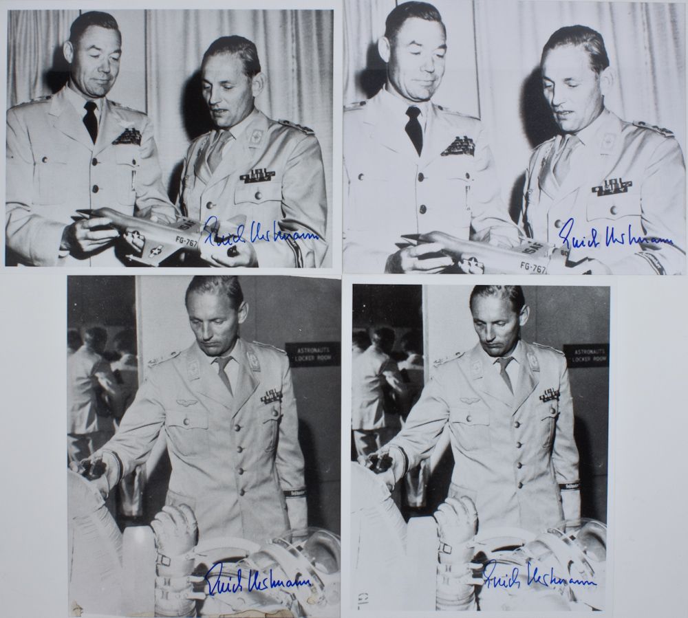 (b. 1922) German ace, the top ace of all time, with 352 aerial kills during which he never lost a wing man. Captured and held by the Soviets for ten years. Holder of the Knights Cross with Oak Leaves, Swords and Diamonds. Group of four S.P.s, 8" x 10" each, contemporary reproductions of vintage shots showing Hartmann standing over a reclined astronaut and examining a model of a FG-767. Each is boldly signed in blue marker. One bears some coffee stains at bottom margin, clear of signature, otherwise fine condition, four pieces.
