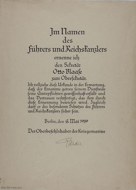 (1876 - 1960) Commander and Chief of the German Navy (1933 - 1943) who was largely responsible for its expansion. Retired over growing differences with Hitler. Partly-printed D.S., 1p. sm. folio, Berlin, May 6, 1939, the promotion of Otto Blaase to the rank of Obersekretaer. Nicely signed, with blind embossed official seal. Very good to fine.