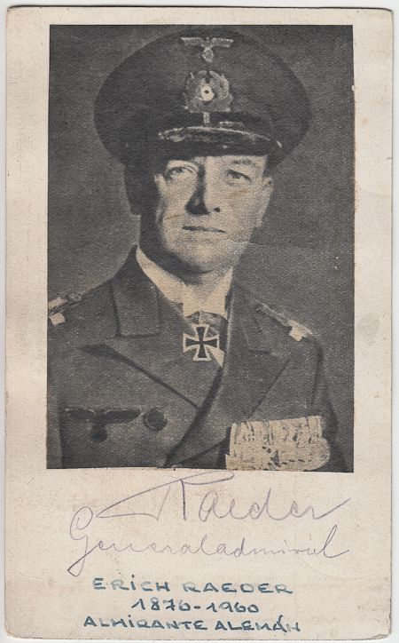 (1876 - 1960) Commander and Chief of the German Navy (1933 - 1943) who was largely responsible for its expansion. Retired over growing differences with Hitler. S.P. 3 1/2" x 5 1/2" b/w, a mounted photo of Raeder removed from a magazine beneath which he signs and adds his rank as "Grossadmiral". Collector's notation beneath, a few flaws to the image, otherwise good condition.