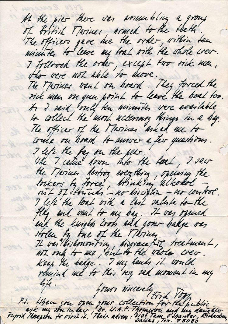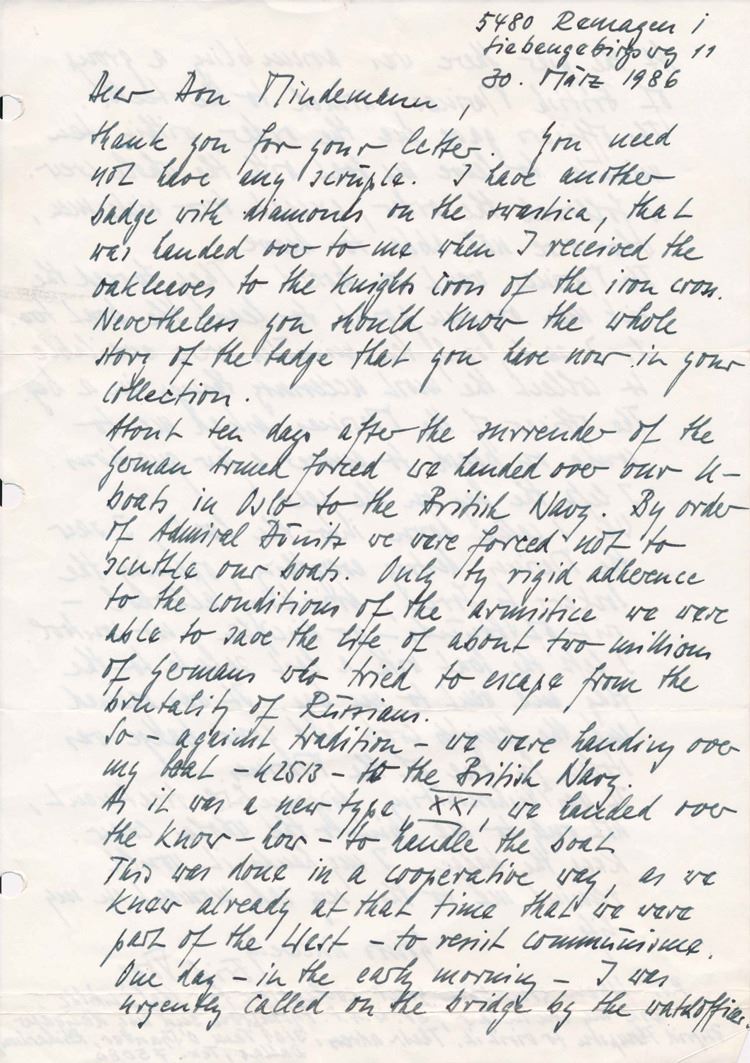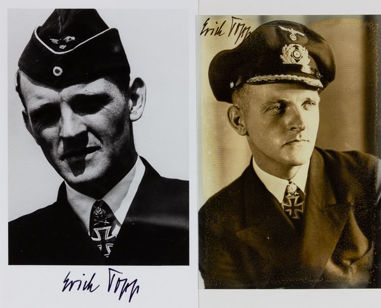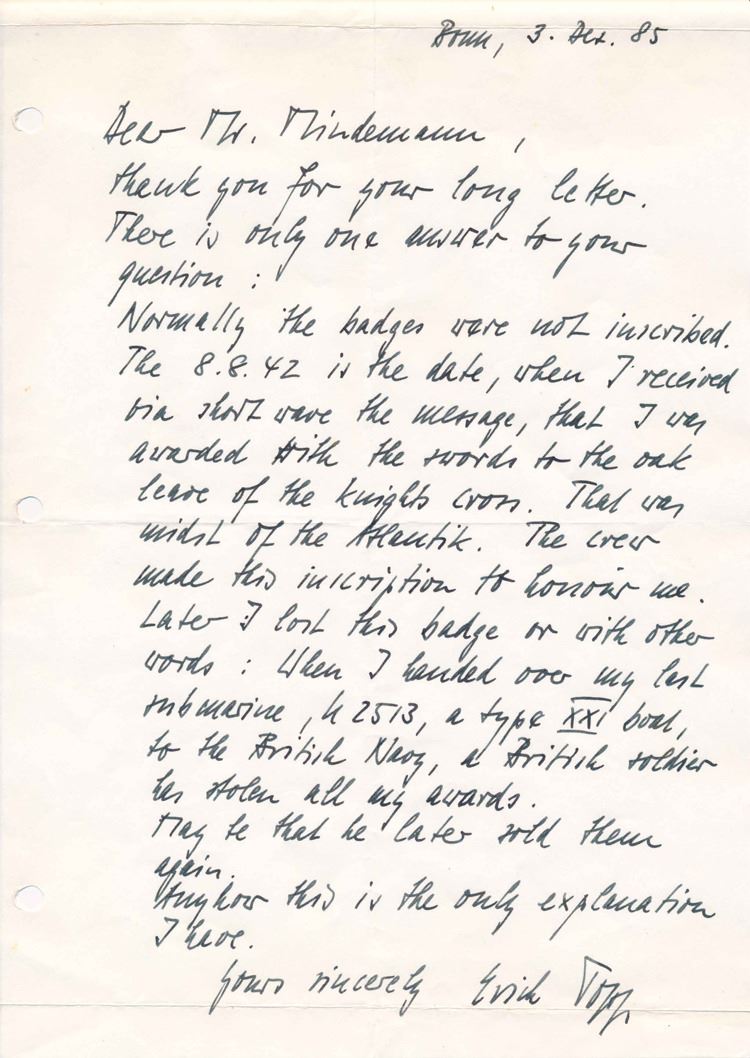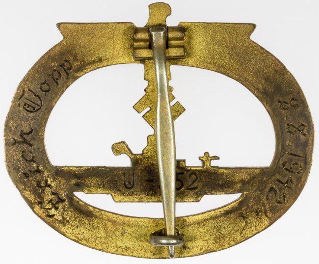 An incredible U-boat item, the U-boat badge issued to ERICH TOPP (1914-2005), the third ranking tonnage leader of all U-boat commanders, sold with two letters Topp personally sent to the badge's original owner describing the loss of this relic. The badge is the commonly issued Kriegsmarine submarine badge, manufactured by Otto Schickle. The reverse of the badge bears distinctive Gothic engraving reading: "Erich Topp 8. 8. 1942" with "U-552"engraved on the reverse of the badge's submarine hull. This badge first surfaced decades ago in the southeast U.S. lacking any provenance. It eventually found its way into the TIME-LIFE U-Boat collection whose owner decided to contact Topp directly concerning the badge he had uncovered. Included in this lot are the two original hand-written letters sent by Topp to the collector in 1985-86 setting forth the history of this piece. The first reply reads, in part: "...Normally the badges were not inscribed. The 8.8.42 is the date when I received via the short wave the message that I was awarded with the swords of the oak leaves of the Knights Cross. That was midst of the Atlantic. The crew made this inscription to honor me. Later I lost this badge, or with other words: when I handed over my last submarine, U2513...a British soldier has stolen all my awards...Maybe he had later sold them again..." The second letter from Topp, several months later, offers more details: "...You need NOT have any scruple. I have another badge with diamonds on the swastika that was handed over to me when I received the oak leaves to the Knights Cross of the Iron Cross. Never the less you should know the whole story of the badge that you now have in your collection...About ten days after the surrender of the German Armed Forced we handed over our U-boats in Oslo to the British Navy...we were handing over my boat - U2513 - to the British Navy...This was done in a cooperative way...One day in the early morning - I was urgently called on the bridge by the ward officers...officers gave me the order, within ten minutes to leave my boat with the whole crew...The officer of the Marines asked me to come on board to answer a few questions. I left the bag on the pier...As I came down into the boat, I saw the Marines destroying everything, opening the lockers by force, drinking alcohol...I left the boat with a last salute to the flag and went to my bag. It was opened and the Knights Cross and your badge was stolen by one of the Marines. It was a dishonoring, disgraceful treatment, not only to me, but to the whole crew. Keep the badge. In my hands it would remind me [of] this very sad moment in my life...". Also included is an excellent half-hull model of a Type VII U-boat from the 7th "Wegener" Flotilla based at St. Nazaire, to which Topp was attached. The fine, detailed brass hull is fitted to a 13 1/4" x 5" finished wood base painted with flotilla emblems. Provenance: TIME-LIFE Collection, The War Museum. Exhibited at the New York Historical Society: "NYC and WWII".