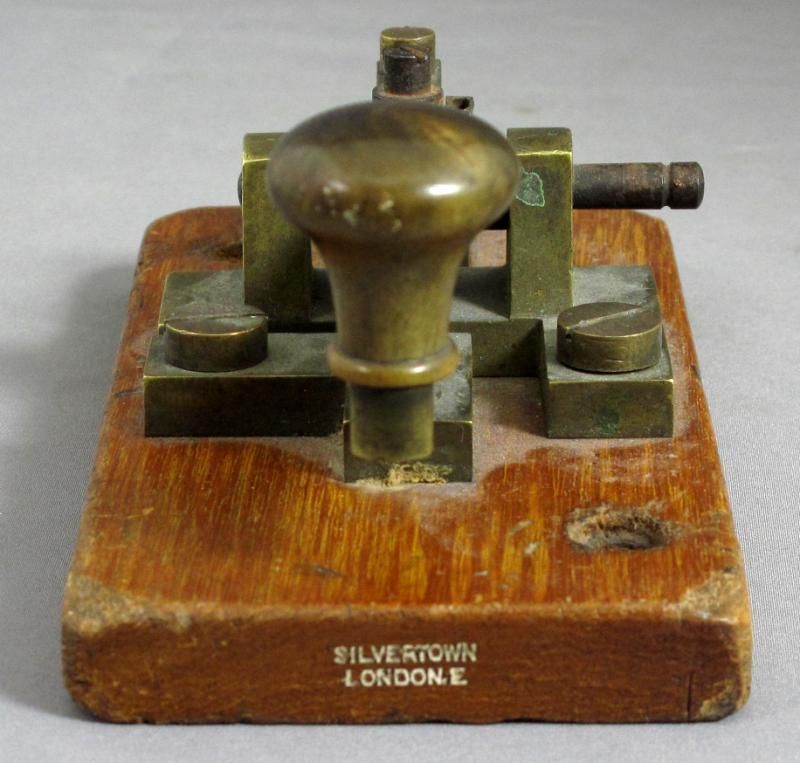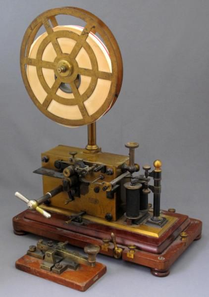 -Serial #: 49981. Early 20th century, brass with mahogany base, clockwork mechanism with key. The recorder prints out the message received as Morse code on paper tape.
