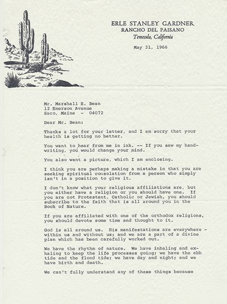(1889 - 1970) American mystery writer and lawyer, one of the most prolific authors, writing over 80 detective novels featuring the courtroom lawyer Perry Mason. Fine spiritual content T.L.S. on his personal letterhead, 2pp. 4to., Temecula, May 31, 1966. In part: "...you should subscribe to the faith that is all around you in the Bok of Nature...God is all around us...we are part of a divine plan. We have the rhythm of nature...we have the ebb tide and the flood tide...you will find many signs that have been given you of thge omnipotence of the deity...the stars at night are a sign...". Fine.