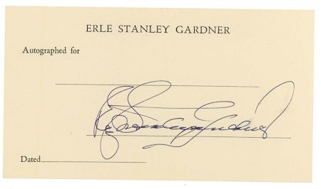 (1889 - 1970) American mystery writer and lawyer, one of the most prolific authors, writing over 80 detective novels featuring the courtroom lawyer Perry Mason. Bold, full signature on his imprinted autograph card. Fine.