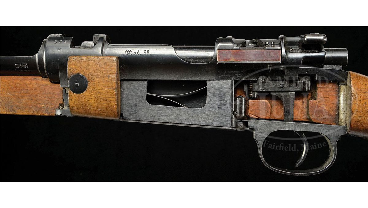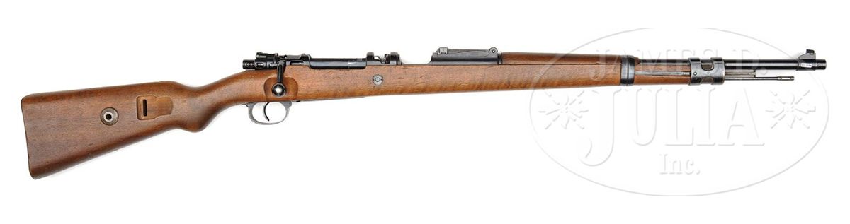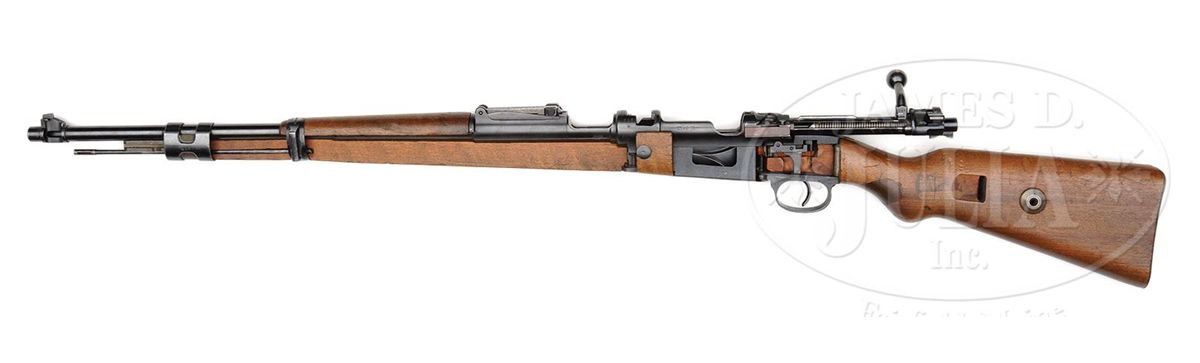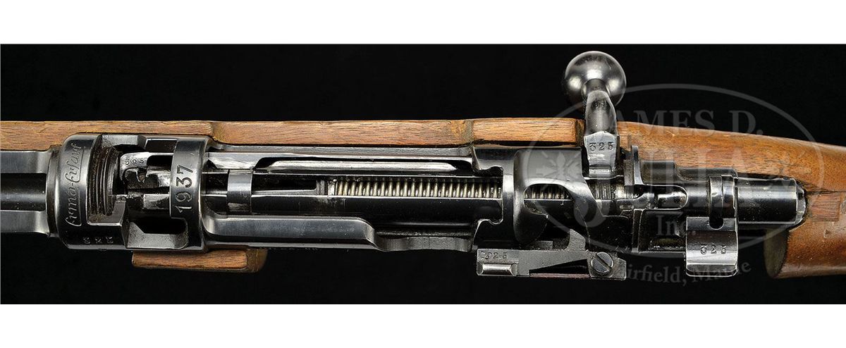 SN 325. Cal. 8mm. Near pristine example of a factory produced Erma Cutaway Training Rifle produced in 1937. All metal parts matched, to include locking screws and walnut stock, with sections expertly cut away to demonstrate the function of the mechanism. These examples were used for initial training of German Soldiers before and during the war. Various metal parts are marked WaA 77 and many are overstamped with a large "U" (for "Übung" or "Exercise/Training"). Two stock inserts at the left wrist and butt appear to be factory repairs. A rare opportunity to obtain an exceptional, authentic factory produced cutaway and the centerpiece to any K98 collection. PROVENANCE: Collection of Dr. Geoffrey Sturgess. CONDITION: Excellent. Bluing 98%. Bore is excellent. 4-53101 DW4