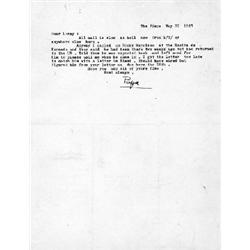 <b>427. ERNEST HEMINGWAY</b> (1899 - 1961)<b> </b>American author, a Nobel prize winner and author of <i>For Whom the Bell Tolls</i>, <i>A Farewell to Arms</i>, <i>The Old Man and the Sea</i>, and other classic novels. Good content T.L.S. "<i>Papa</i>" 1P. 4to., [San Francisco De Paula, Cuba], May 21, 1957 to Leonard Lyons of the New York Post concerning Rocky Marciano. In full: "<i>Dear Lenny: All mail is slow as hell now from N/Y/ or anywhere else here. Anyway I called up Rocky Marciano at the Rosita de Horendo and they said he had been there two weeks ago but had returned to the US. Told them he was expected back and left word for him to please call me when he came in. I got the letter too late to catch him with a letter in Miami. Should have wired but figured him from you letter as due here the 20th. Hope you and all of yours fine. Best always, Papa.</i>" Usual folds, otherwise near fine condition.<b>$1,500-2,000</b>