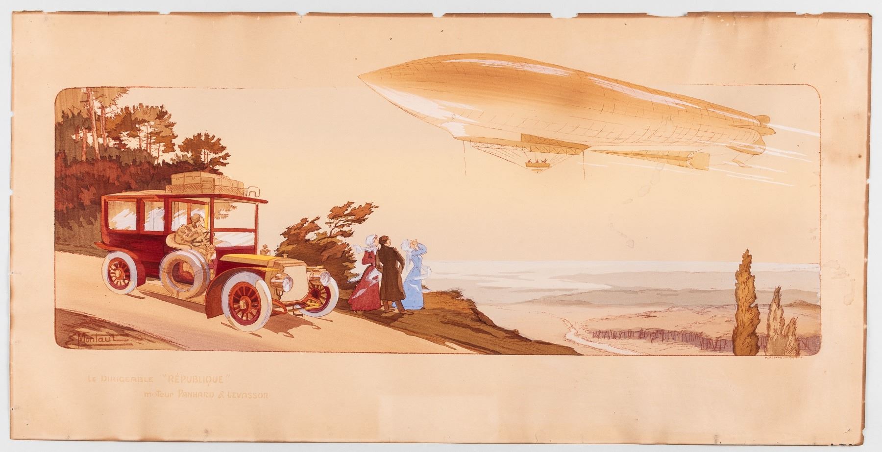 'The Dirigible 'Republic' Engine Panhard & Levassor', artwork by Ernest Montaut, (1878-1909), M.M. Paris, 1909, approx. 35.25 x 17.75 inches. Loss at top margin, sunning on edges, minor tears at bottom margin, minor holes at bottom right corner.