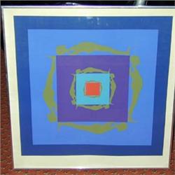 ERNEST TINO TROVA(American, b. 1927) silkscreen in colors, 1969, from Fallen Man series, brushed aluminum frame. One small tear and minor creasing at edges, Pencil signed Trova,'69 lower right. Sight: 26 1/2" x 25 1/2" $100 - 150