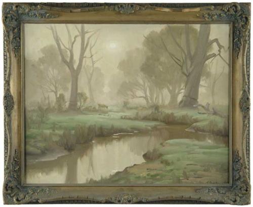 ERNEST WILLIAM BUCKMASTER (Australian, 1897-1968) HAZY CREEK WITH COW. Oil on canvas scene of a creek with grasses and large trees having one solitary cow under a foggy sunlit backdrop. Signed lower right “E. Buckmaster”. Housed in its original gesso decorated frame, which has edge pieces missing. PROVENANCE: From the Estate Collection of James D. Jacobs, Managing Director of Standard Vacuum Oil Company, Melbourne. SIZE: 25” x 32”. CONDITION: Very good. 9-26935