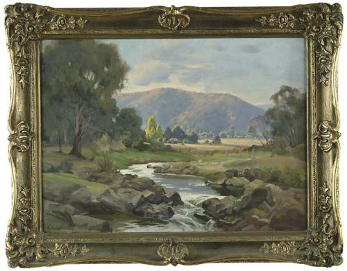 ERNEST WILLIAM BUCKMASTER (Australian, 1897-1968) “EVENING LIGHT, MYRTLEFORD”. Oil on canvas landscape scene shows winding brook with rocky and grass banks, exiting valley with farm and sun shining on tall trees. A mountain backdrop under blue lit skies. Signed lower left “E. Buckmaster”. Housed in its original gesso decorated fancy frame. Title is on back of paper backing. PROVENANCE: From the Estate Collection of James D. Jacobs, Managing Director of Standard Vacuum Oil Company, Melbourne. SIZE: 22” x 30”. CONDITION: Very good. 9-26934
