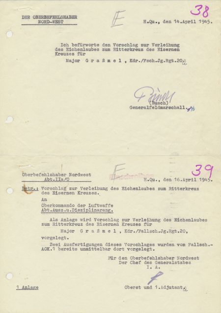 (1885 - 1945) German field marshal, served under List during the invasion of Poland and the following year led the German 16th Army during the Western Offensive. Defeated in Russia, he was sacked by Hitler, recalled to defend Montgomery's advance, and died in a POW camp after capture. Rare late war D.S. "Busch" in pencil, 1p. oblong 8vo., [n.p.], Apr. 14, 1945, his notice forwarding a recommendation for the addition of oak leaves to the Knights Cross issued to FRANZ GRASSMEL (1906-1985), commander of the Paratroop Regiment 20 who received his Oak Leaves on May 8th (V-E Day!).