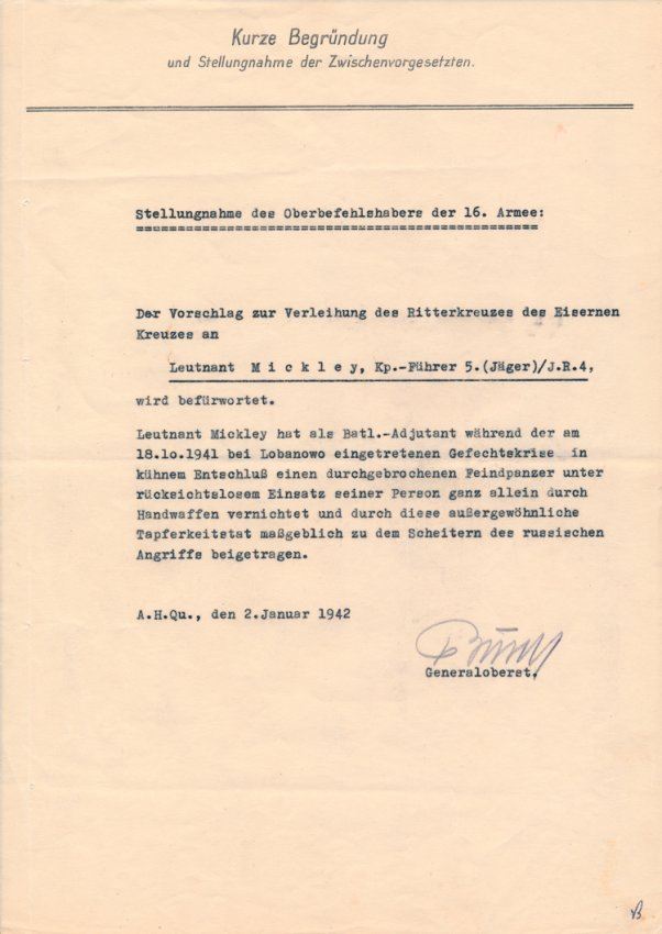 (1885 - 1945) German field marshal, served under List during the invasion of Poland and the following year led the German 16th Army during the Western Offensive. Defeated in Russia, he was sacked by Hitler, recalled to defend against Montgomery's advance, and died in a POW camp after capture. Typed D.S. in pencil, 1p. 4to., [n.p..], Jan. 2, 1942, agreeing to a recommendation that the Knights Cross be awarded to HUBERT MICKLEY (1918-1944). In part: "...on October 18, 1941...with disregard of his own person, by himself, destroyed an enemy tank with hand weapons...and he played an important part in the arresting of the Russian attack...". Mickey would be awarded his Knights Cross, and receive his Oak Leaves on Aug. 4, 1944. He would be killed at Bastogne during the Battle of the Bulge.