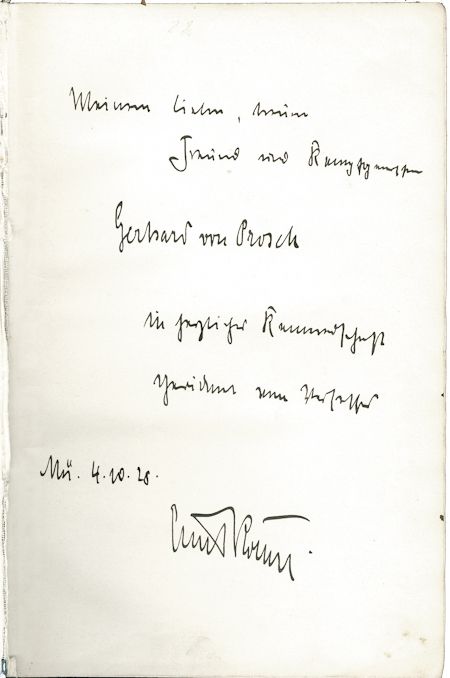 (1887 - 1934) Nazi Brownshirt who organized, trained, and headed the SA, a friend of Hitler who was at his side in the 1923 Beer Hall Putsch, later set-up and executed by Hitler following their disagreement on the use of the two million-strong SA. Fine association signed book, his volume Wehr in Ehr (Munich: Verlag Franz Eher Nachf, 1928?), 348pp. hardbound, inscribed on first free endpaper: "To my dearest friend and brother in arms Gustav von Prosch, my dear comrade. Signed by the author. Munich, 10. 4. 1928 Ernst Röhm". Gerhard von Prosch was a German aviator during World War I, and received the Saxon Albert Order-Knight 2nd Class with Swords on Aug. 8, 1928 as a Lieutenant in Infantry Regt 192. He was probably the Lt. von Prosch of Saxon 108th, 1926 (Honor Rank List). According to Ernst Rohm: Hitler's SA Chief of Staff, von Prosch participated in meetings for the SA during 1933-34. Light staining to dedication page, good to very good condition.