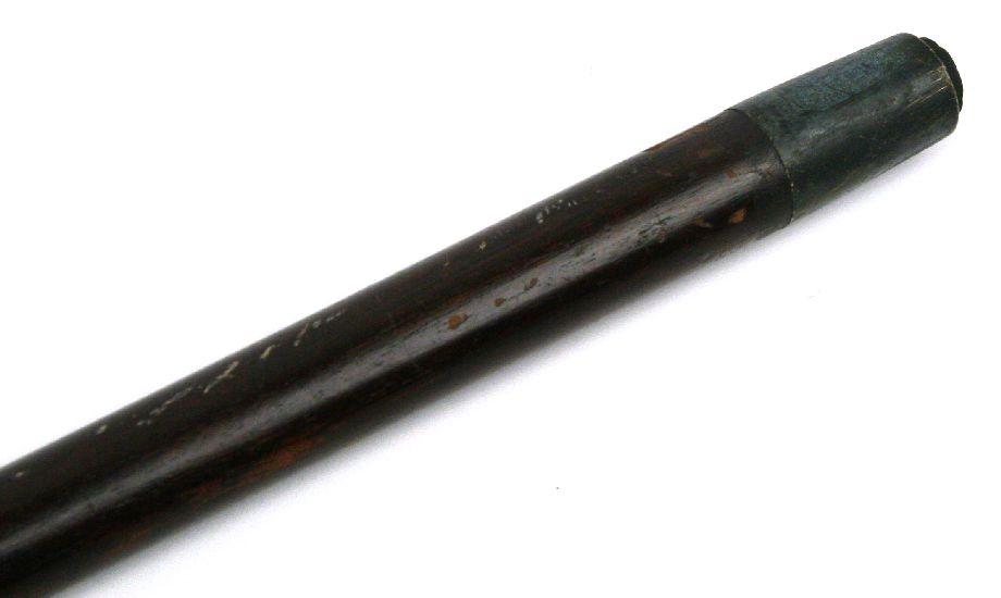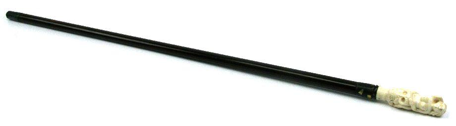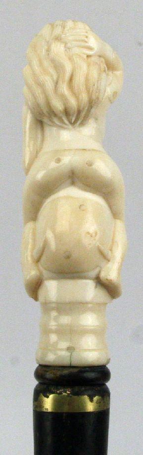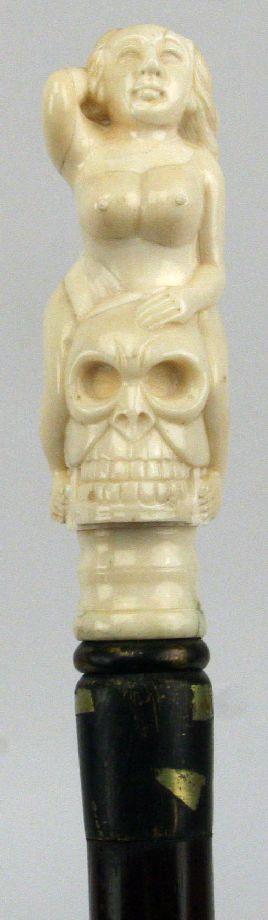 35 inch long mahogany cane with an erotic ivory topper of a nude seated on a skull. Overall very good condition with some wear to brass tips and wood.