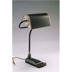 ERPEES Tischleuchte, Metall, schwarz lackiert, verchromt. Querformatiger drehbarer Reflektor, montiert in eine oval geschwungene Halterung, leicht geschwungener Schaft, schmaler länglicher Stand mit Ablagemulde. Min. Gebrauchsspuren. H.: 43 cm. Dort bez.: ERPEES. Seitl. am Reflektor bez.: PATENT ERPEES. Um 1920