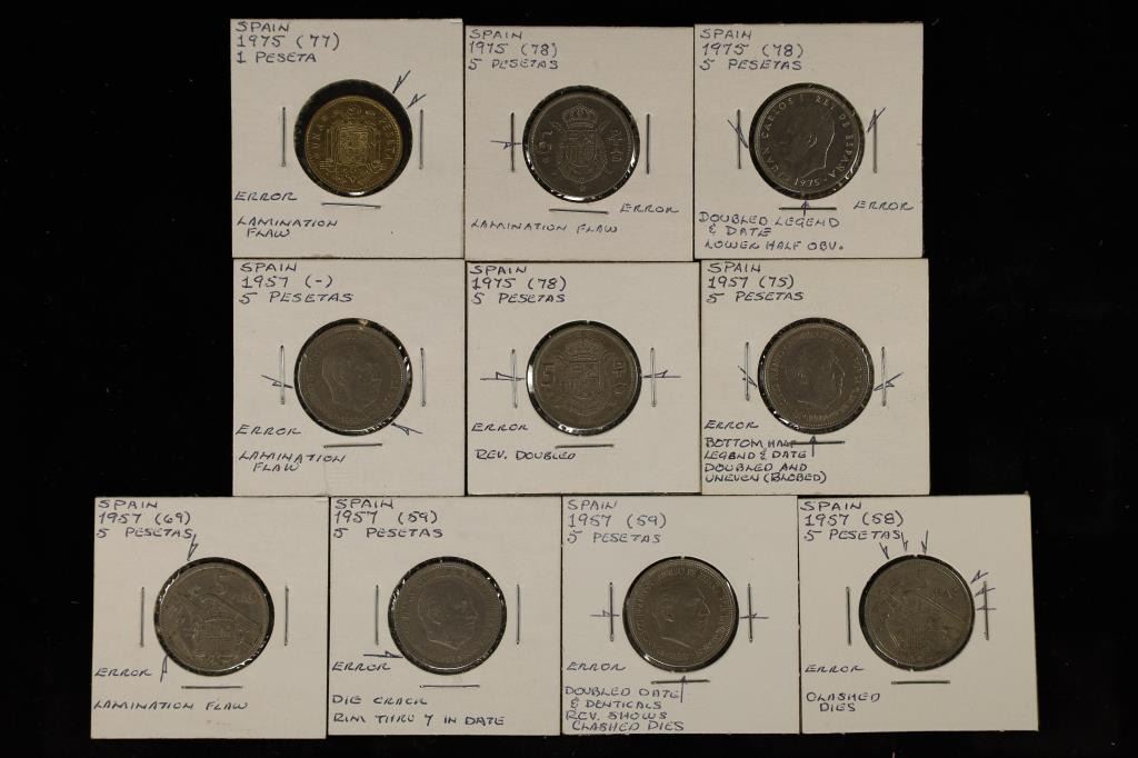 ONE 1 PESETAS AND 9-FIVE PESETAS. LAMINATION FLAWS, CLASHED DIES, DIE CRACKS AND OTHERS