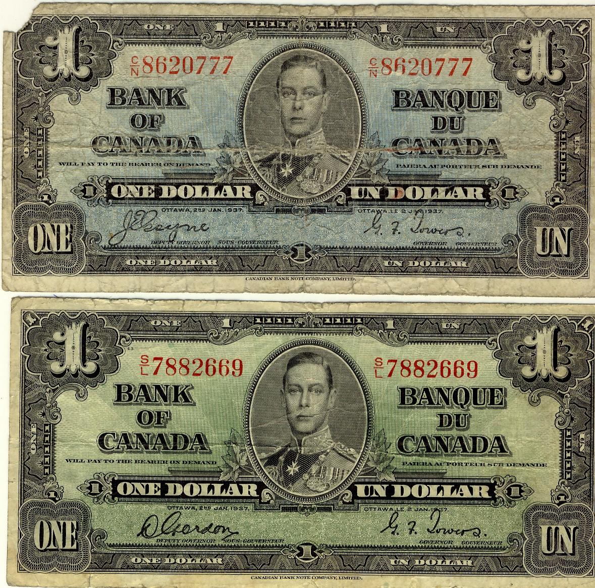 ERROR 1937 $1 BC-21d #CN8620777. The colour of this note actually represents the Blue from the 1937 $5 series. Note is not faded in anyway which leads us to the belief that this is an authentic error. Grades good with missing top left hand corner.