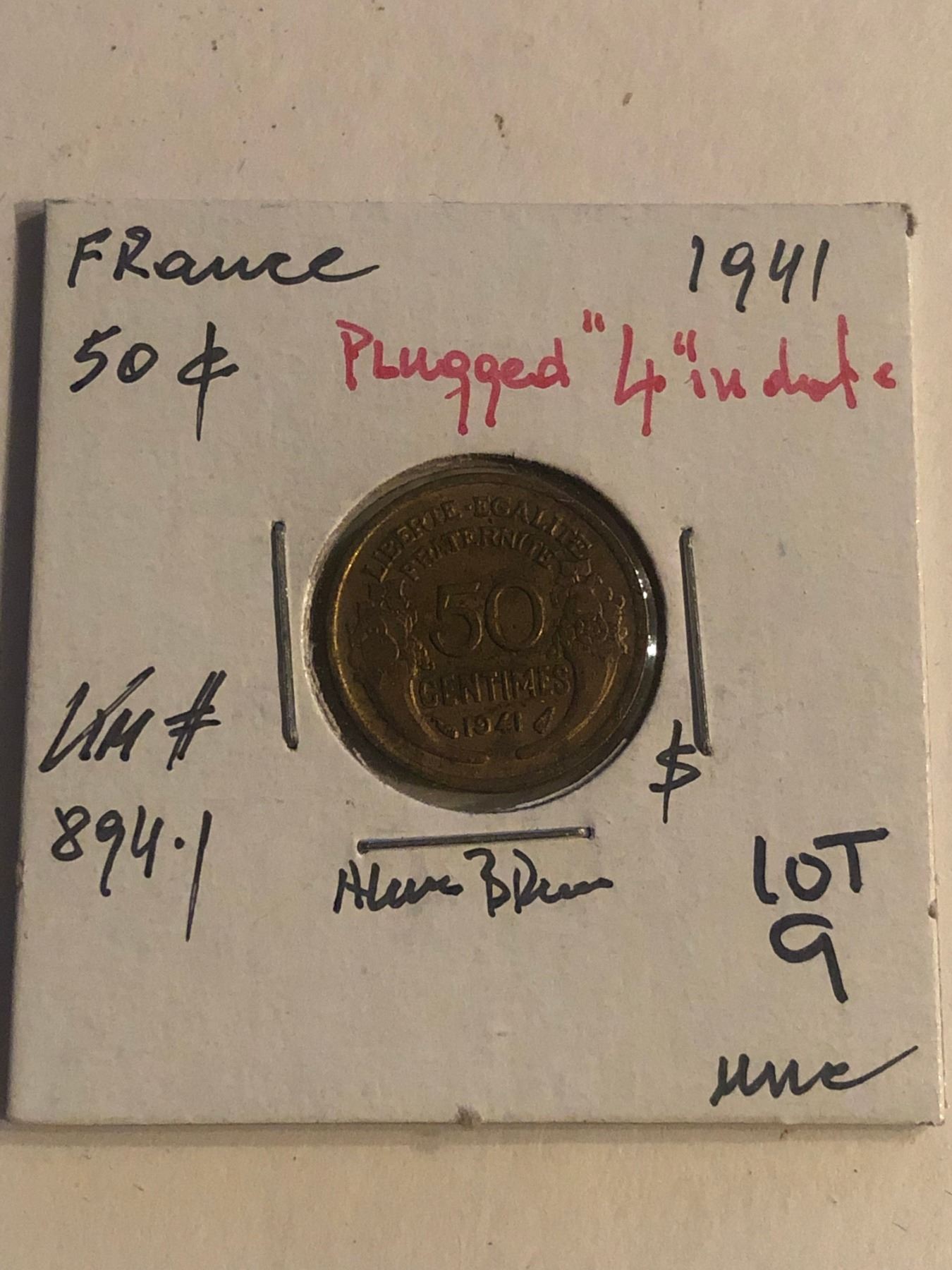 ERROR 1941 France 50 Centimes PLUGGED 4 in Date Uncirculated KM 894.1