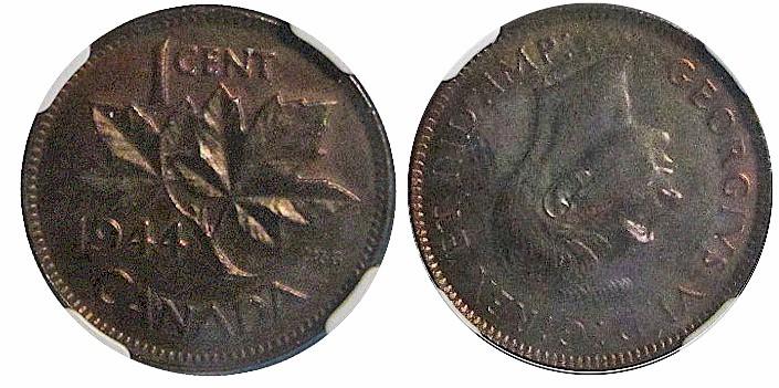 ERROR 1944 1¢ NGC MS62BN. Coin alignment error, 180 degrees.