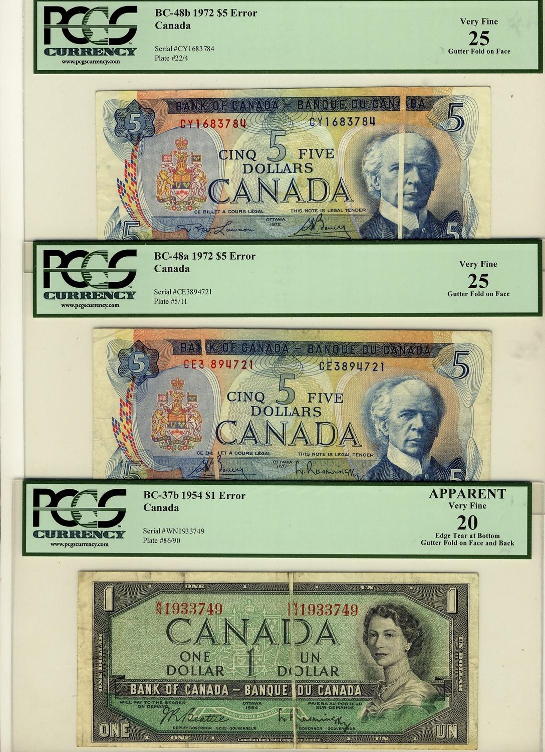 ERROR 1954 $1 BC-37b, 1972 $5 BC-48a & BC-48b. All three notes with gutter folds. All PCGS graded Apparent VF20 and VF25 respectively.