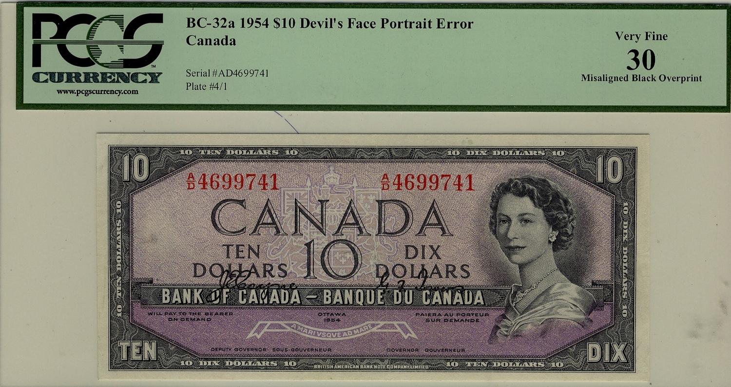 ERROR 1954 $10 BC-32a #AD4699741, PCGS VF30. Misaligned black overprint and signatures. Scarce on devil's face