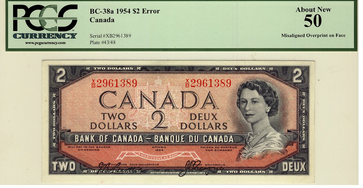 ERROR 1954 $2 BC-38a Misaligned Overprint on Face X/B2961389 PCGS AU50