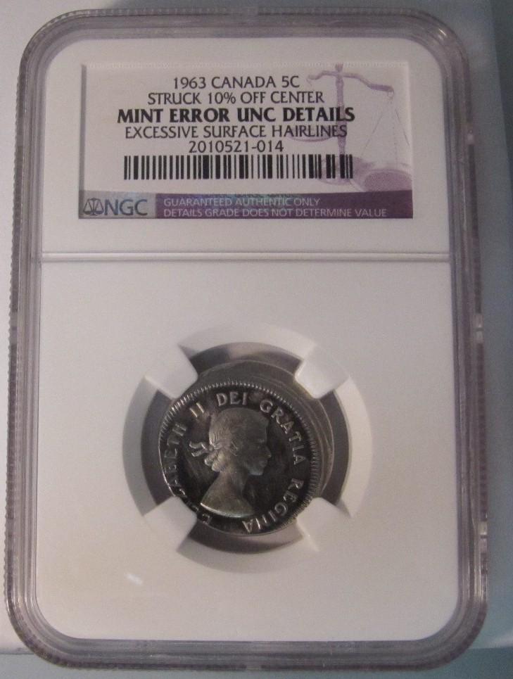 ERROR 1963 5¢ NGC UNC. Struck 10% off center. Designated with excessive surface hairlines.