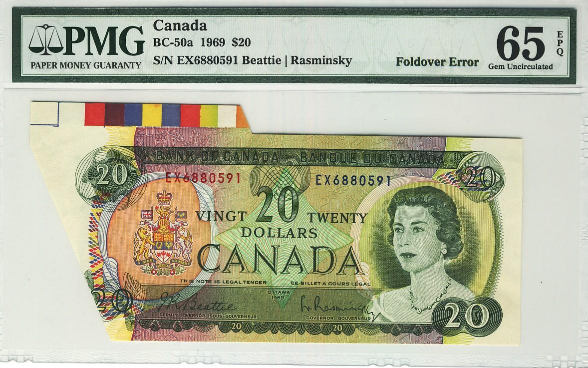 ERROR, 1969 $20 BC-50a #EX6880591, Major Fold Over error PMG Gem UNC65EPQ.