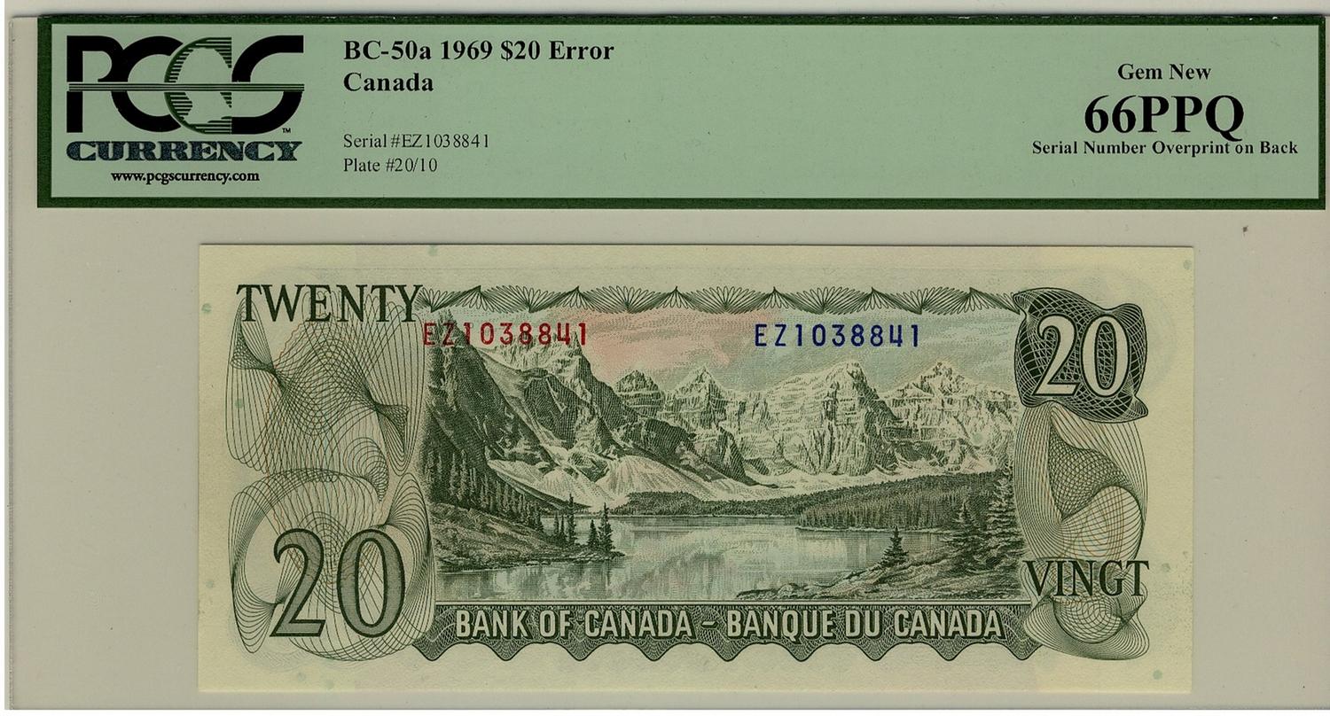 ERROR 1969 $20 BC-50a #EZ1038841, PCGS Gem UNC66PPQ.  Serial number overprint on back offset.