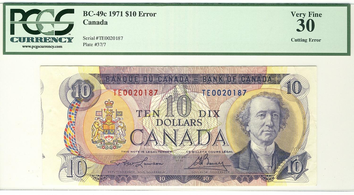 ERROR 1971 $10 BC-49c TE0020187 Cutting Error PCGS VF30