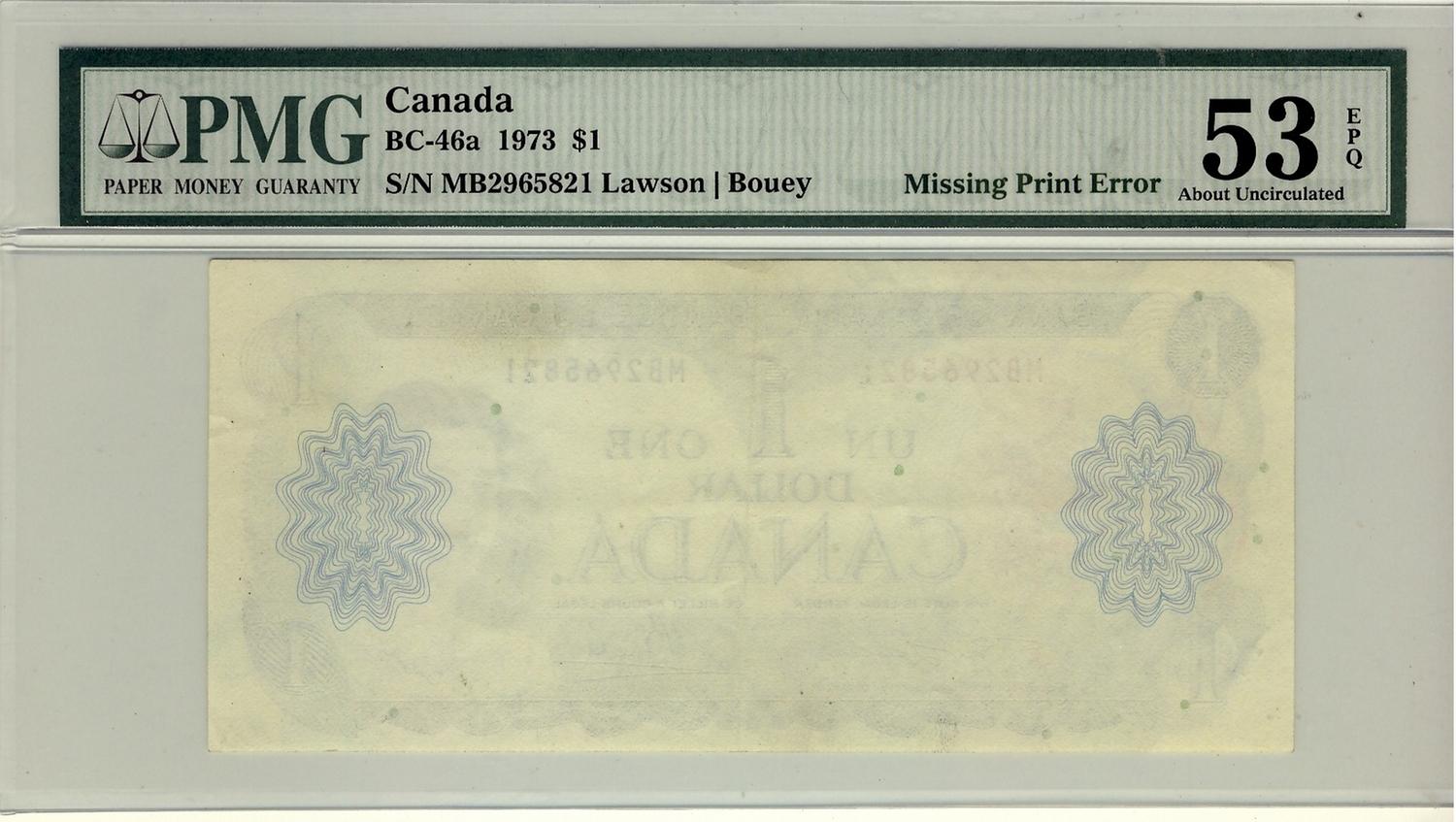 ERROR 1973 $1 BC-46a #MB2965821, PMG AU53 EPQ. Partial Missing first print. Major Flaw.