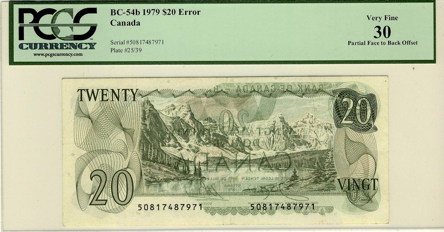 ERROR 1979 $20 BC-54b #50817487971, PCGS VF30. Partial face to back offset.