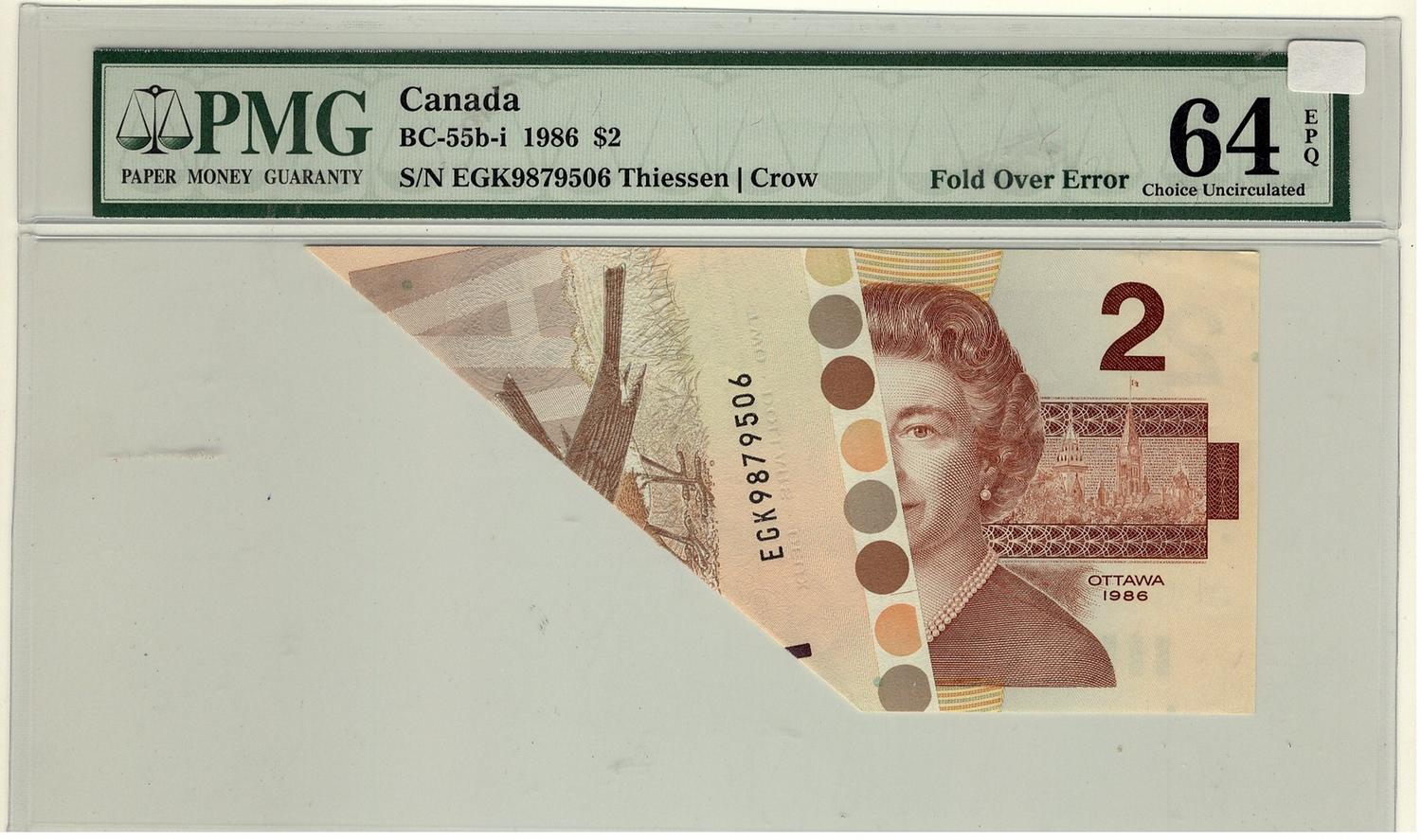 ERROR 1986 $2 BC-55b-I #EGK9879506, PMG CH UNC64EPQ. Major fold over error. (comes with a sequential notes)