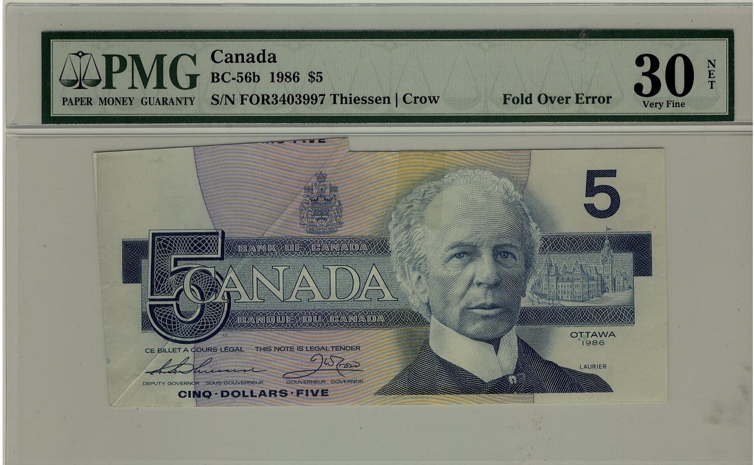 ERROR 1986 $5 BC-56b #FOR3403997, PMG VF30 Net. Fold over error with tape repair.