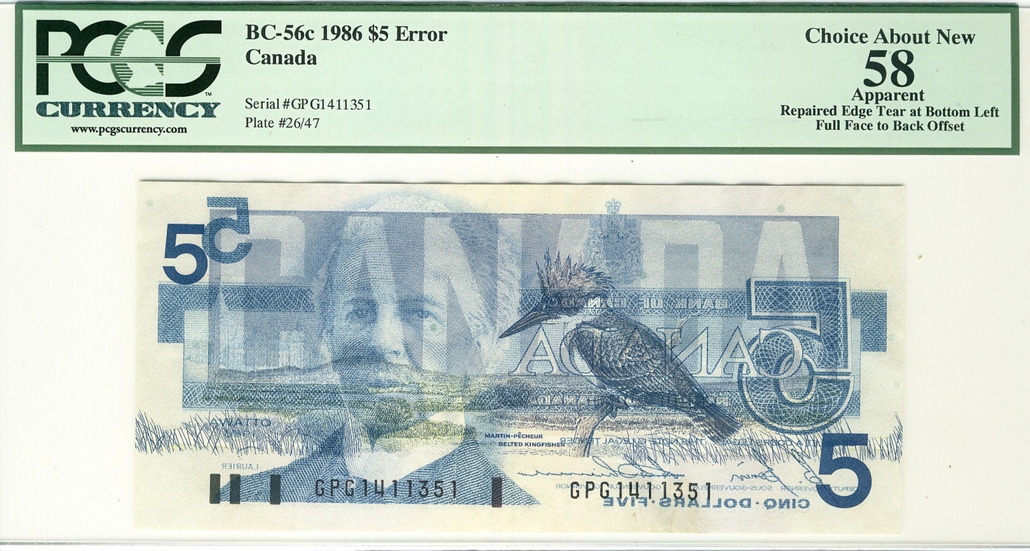 ERROR 1986 $5 BC-56c GPG1411351 Full Face to Back Offset PCGS AU58 App