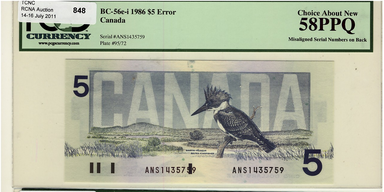 ERROR 1986 $5 BC-56e-i Misaligned Serial Numbers on Back ANS1435759 PCGS AU58PPQ