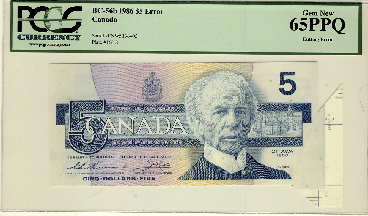 ERROR 1986 $5 Bc-56b FNW5138405 Cutting Error PCGS UNC65PPQ