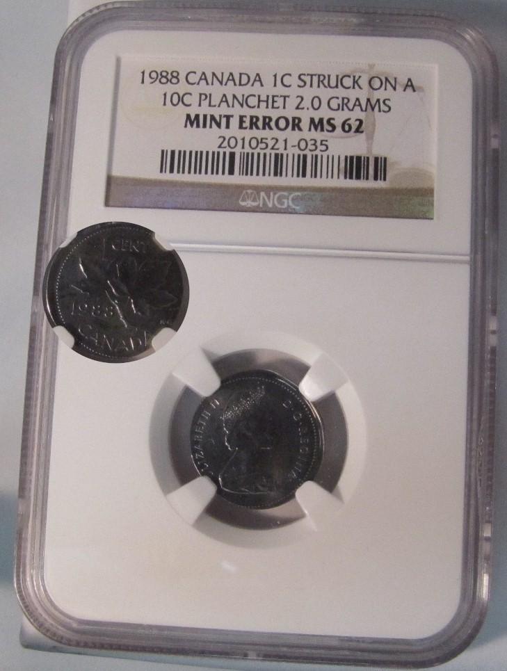 ERROR 1988 1¢ NGC MS62. Struck on a 10¢ planchet, 2.0 gr.
