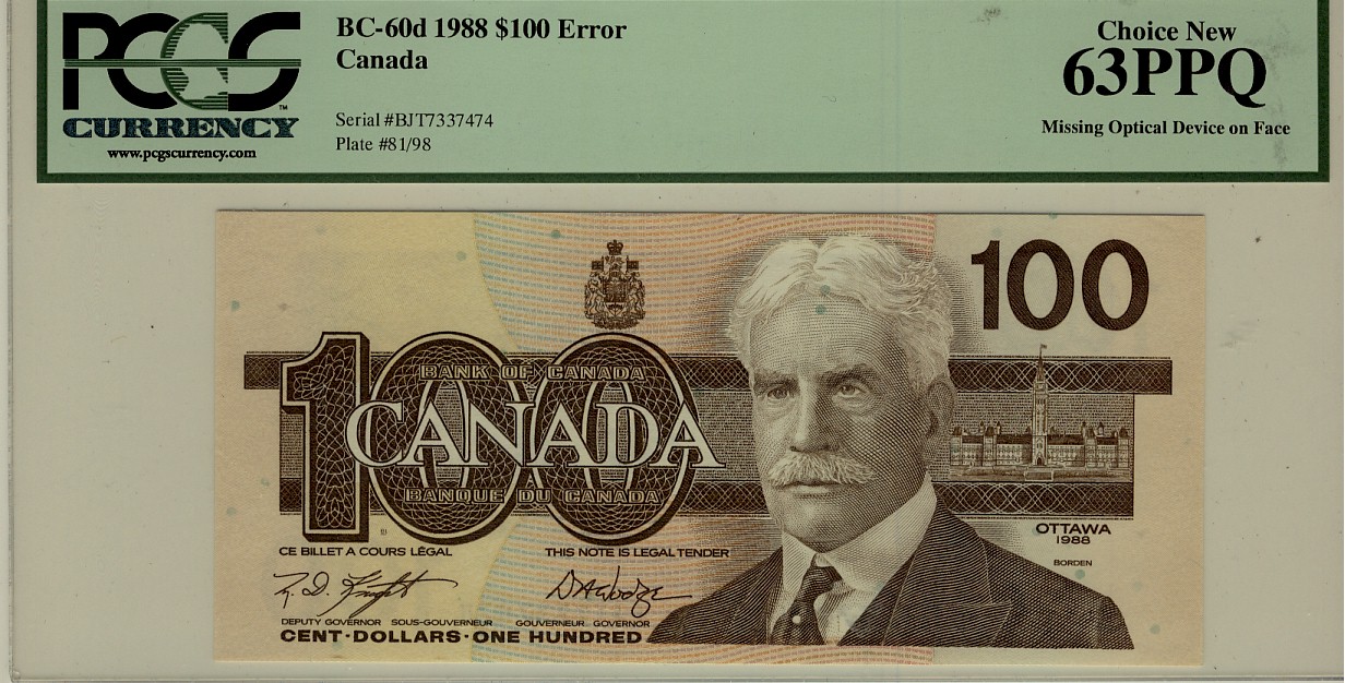 ERROR 1988 $100 BC-60d Missing Optical Device on Face BJT7337474 PCGS UNC63PPQ