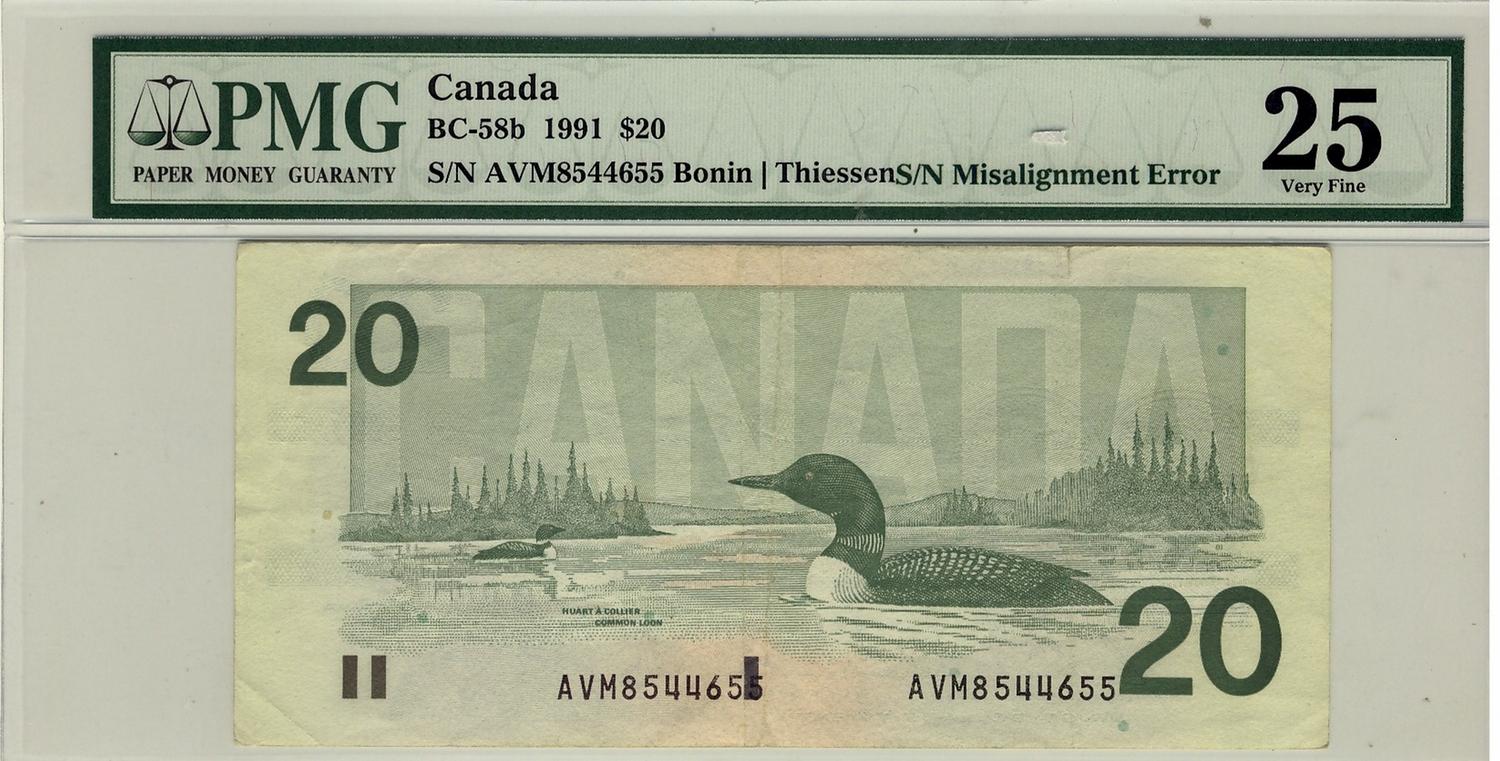 ERROR 1991 $20 BC-58b #AVM8544655, PMG VF25. S/N Misalignment error.