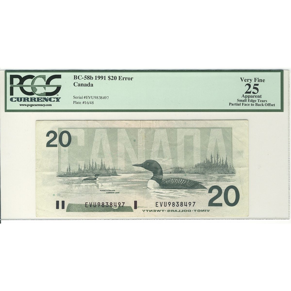 ERROR 1991 $20 BC-58b #EVU9838497 PCGS VF25. Partial Face to Back Offset with Apparent sml edge tears.