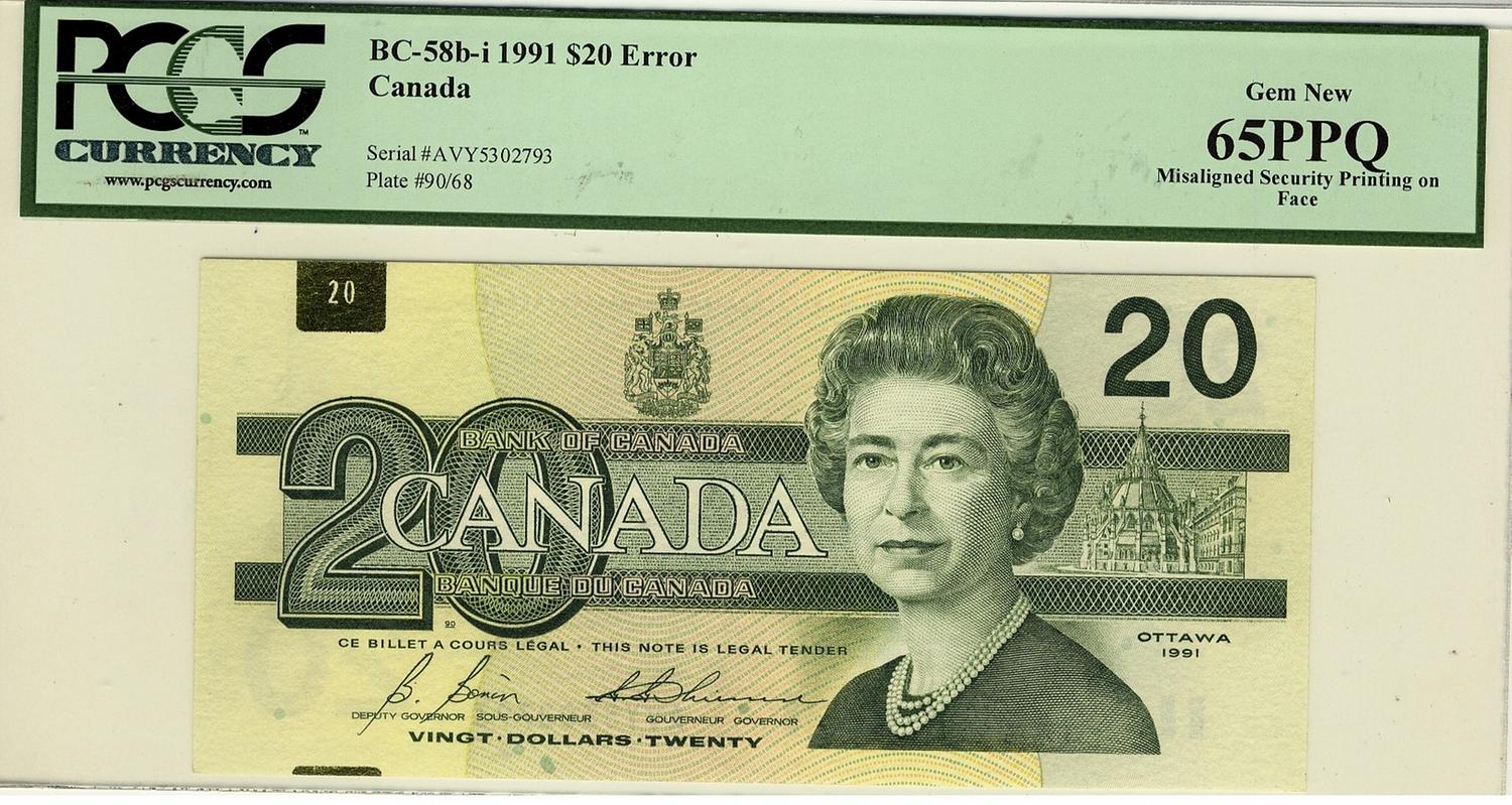 ERROR 1991 $20 BC-58b-I #AVY5302793 PCGS UNC65 PPQ, Misaligned Security Printing on face.
