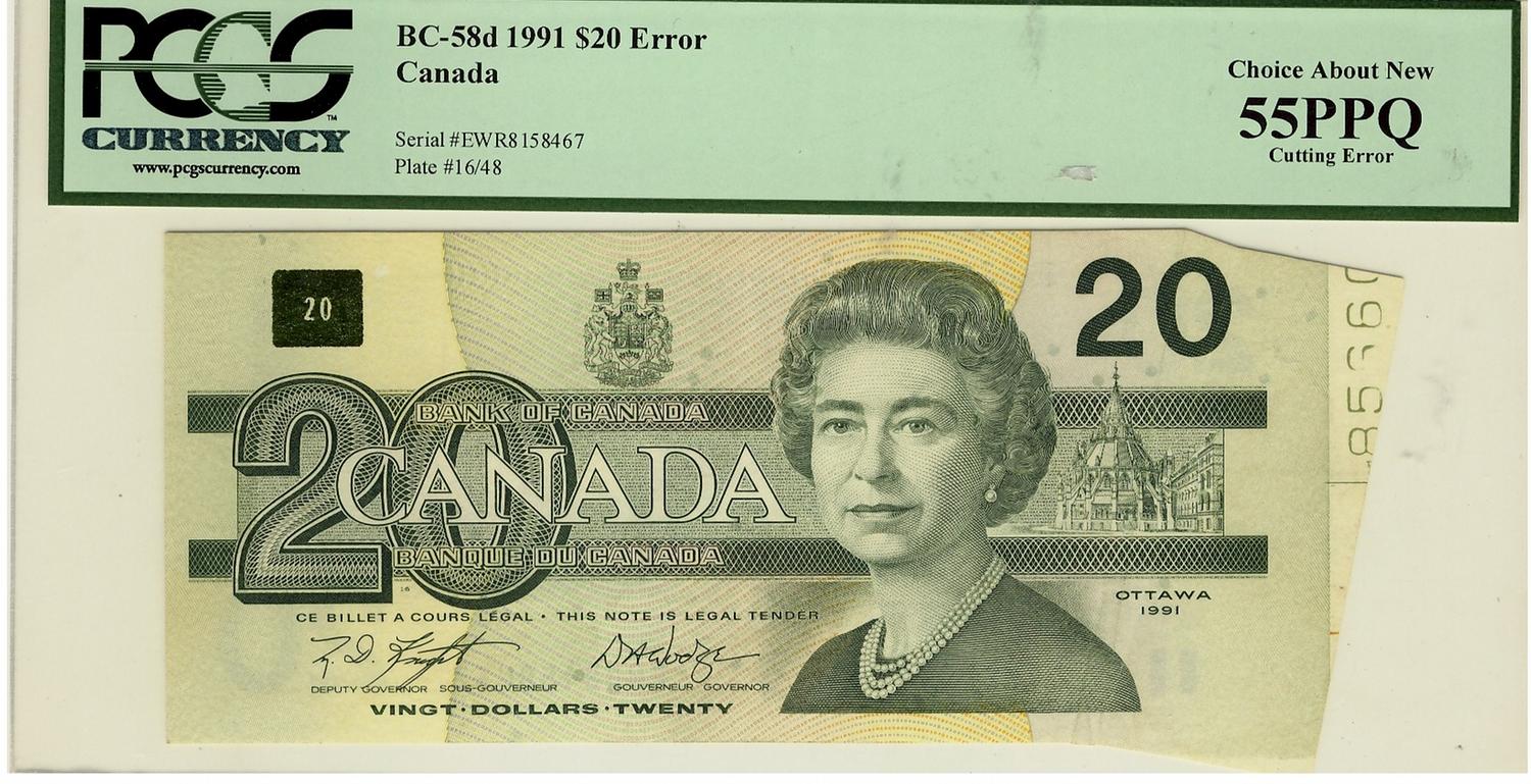 ERROR 1991 $20 BC-58d #EWR8158467 PCGS AU55 PPQ, Cutting Error.