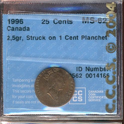 ERROR 1996 25¢ struck on 1¢ planchet, CCCS MS62. Weighs 2,5gr.