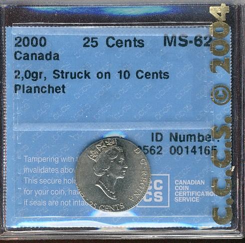 ERROR 2000 25¢ struck on 10¢ planchet, CCCS MS62. Weighs 2,0gr.