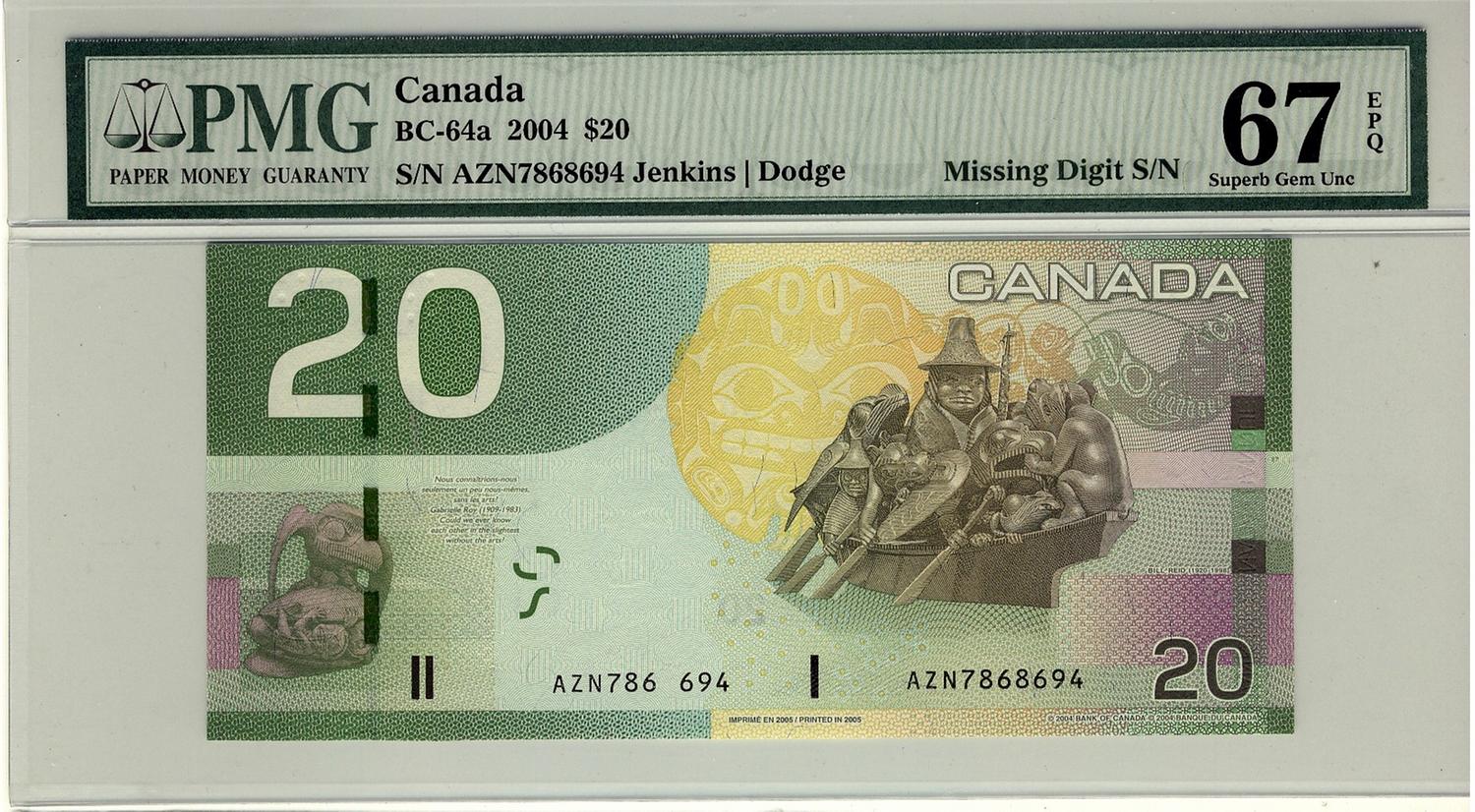 ERROR 2004 $20 BC-64a BC-64a #AZN7868694, PMG Superb Gem UNC67EPQ.  Missing digit S/N.