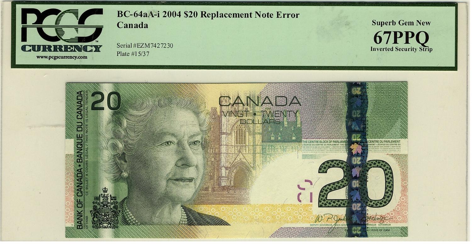 ERROR 2004 $20 BC-64aA-I #EZM7427230, PCGS Superb Gem UNC67PPQ. Replacement issue with inverted security strip. Excessively rare.