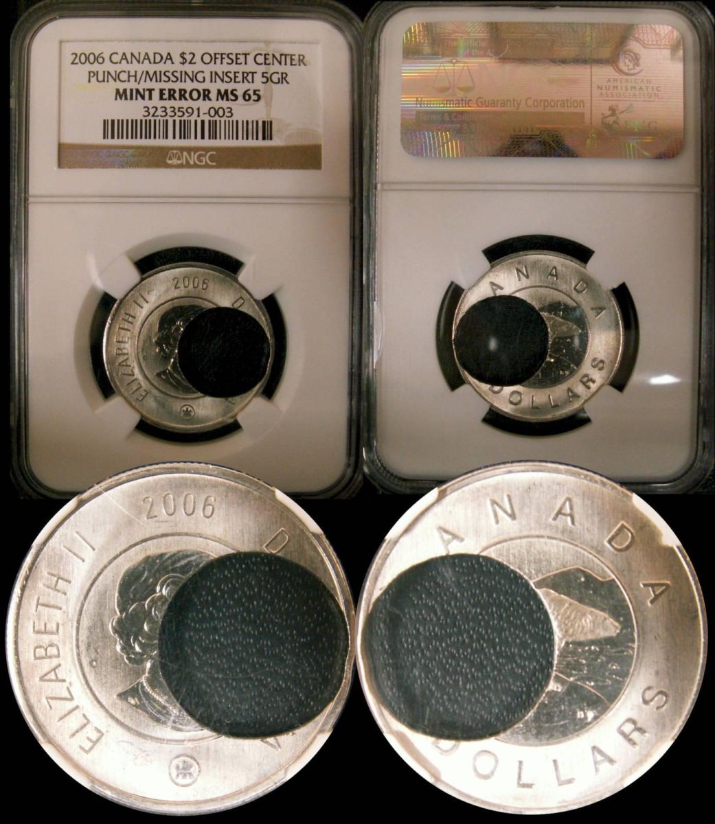 ERROR 2006 $2 NGC MS65. DRAMATIC ERROR, Offset Center punch, missing center Insert and the coin is completely silver with the gold plating missing as well. An absolute must see.