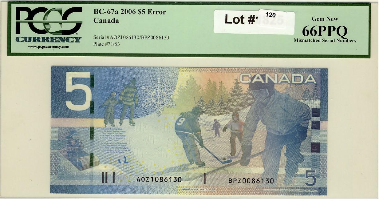 ERROR 2006 $5 BC-67a #AOZ1086130, PCGS Gem UNC66PPQ. Mismatched serial numbers and prefix. Similar to Lot 1059 (February 2010) sold for $5750.