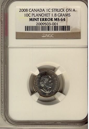 ERROR 2008 1¢, struck on a 10¢ planchet. Weighs 1,8 gr NGC MS64.
