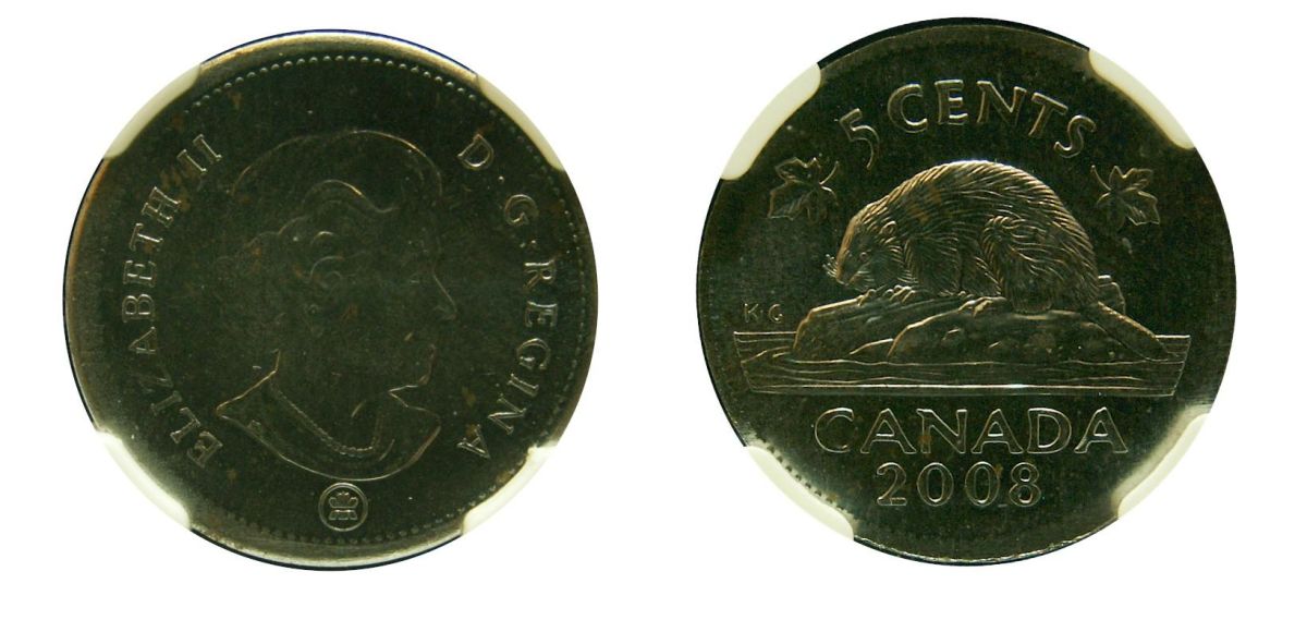 ERROR 2008 5¢ struck on a foreign magnetic blank. Weighs 3,0 gr NGC MS65.